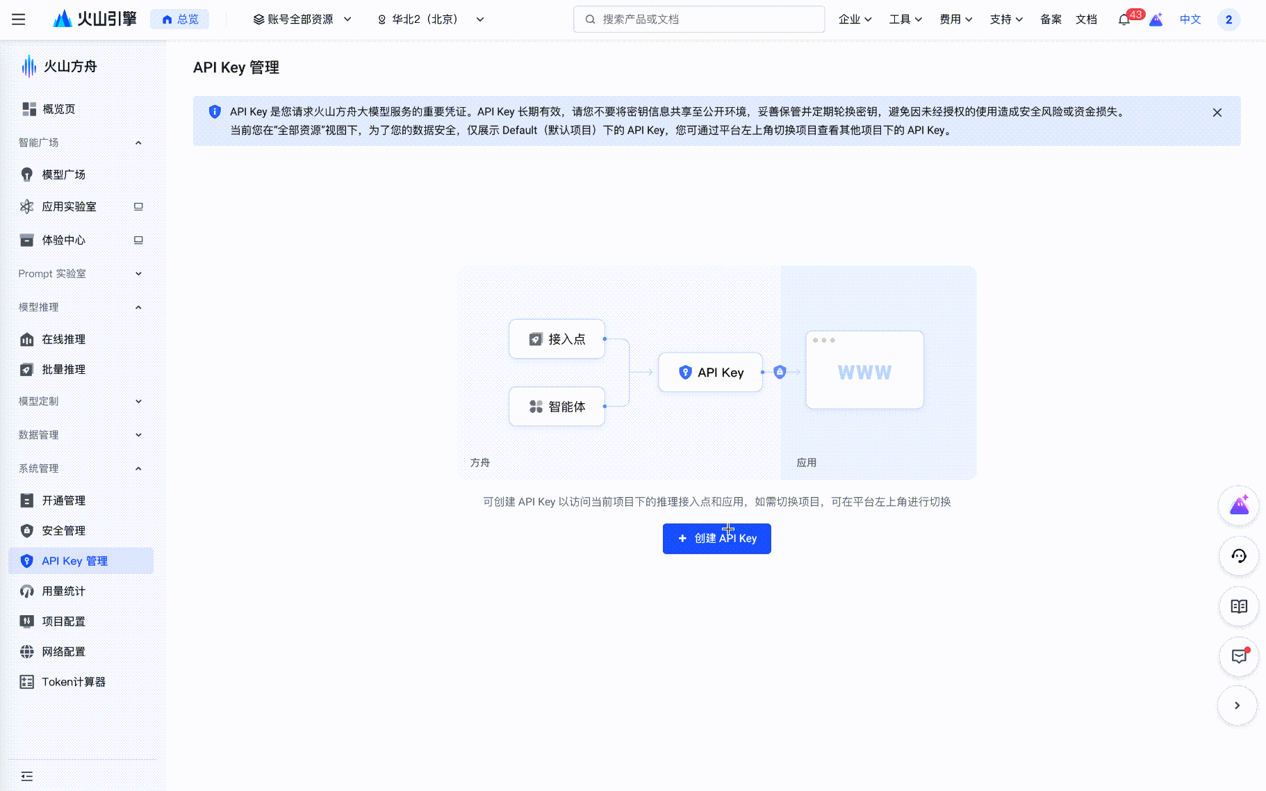 - Select "API Key Management" (API Key 管理) in the left navigation bar of Volcano Ark.